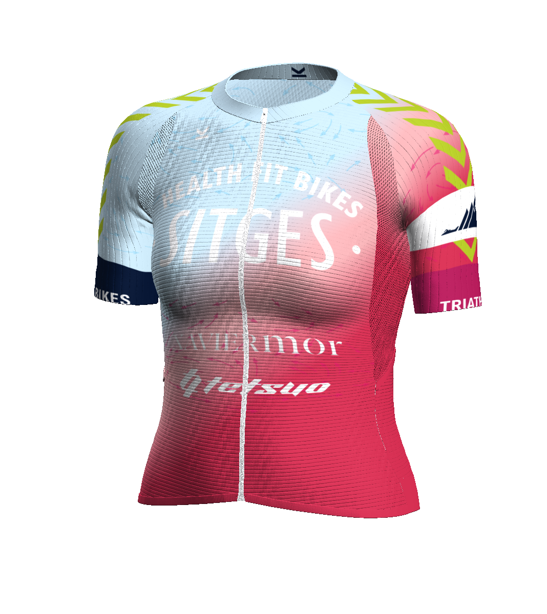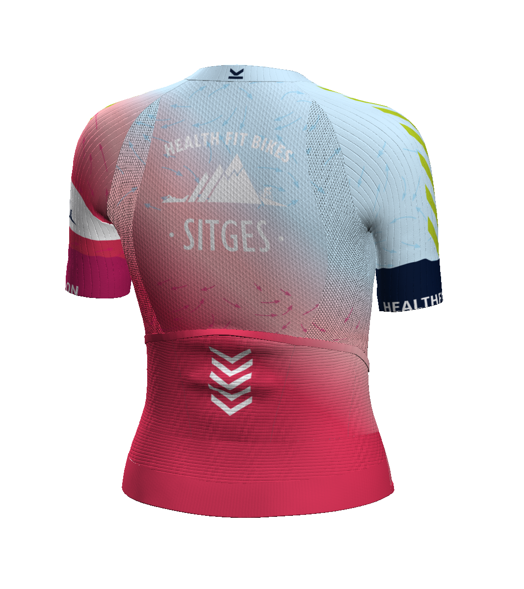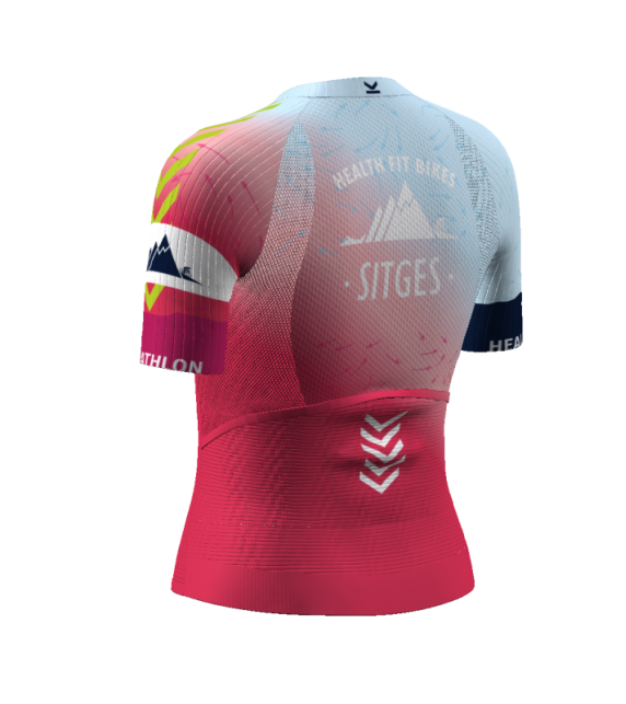 - IBS. Patronaje adaptado a la postura de ciclismo (hombros y escápulas hacia delante). Malla súper elástica bajo hombros/axilas para facilitar los movimientos de los brazos.