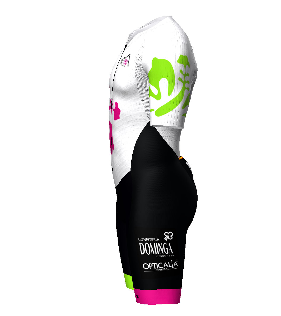 - Patronaje adaptado a los movimientos del pedaleo y carrera a pie gracias a una acentuada precurva en la zona de unión entre pierna y glúteo.